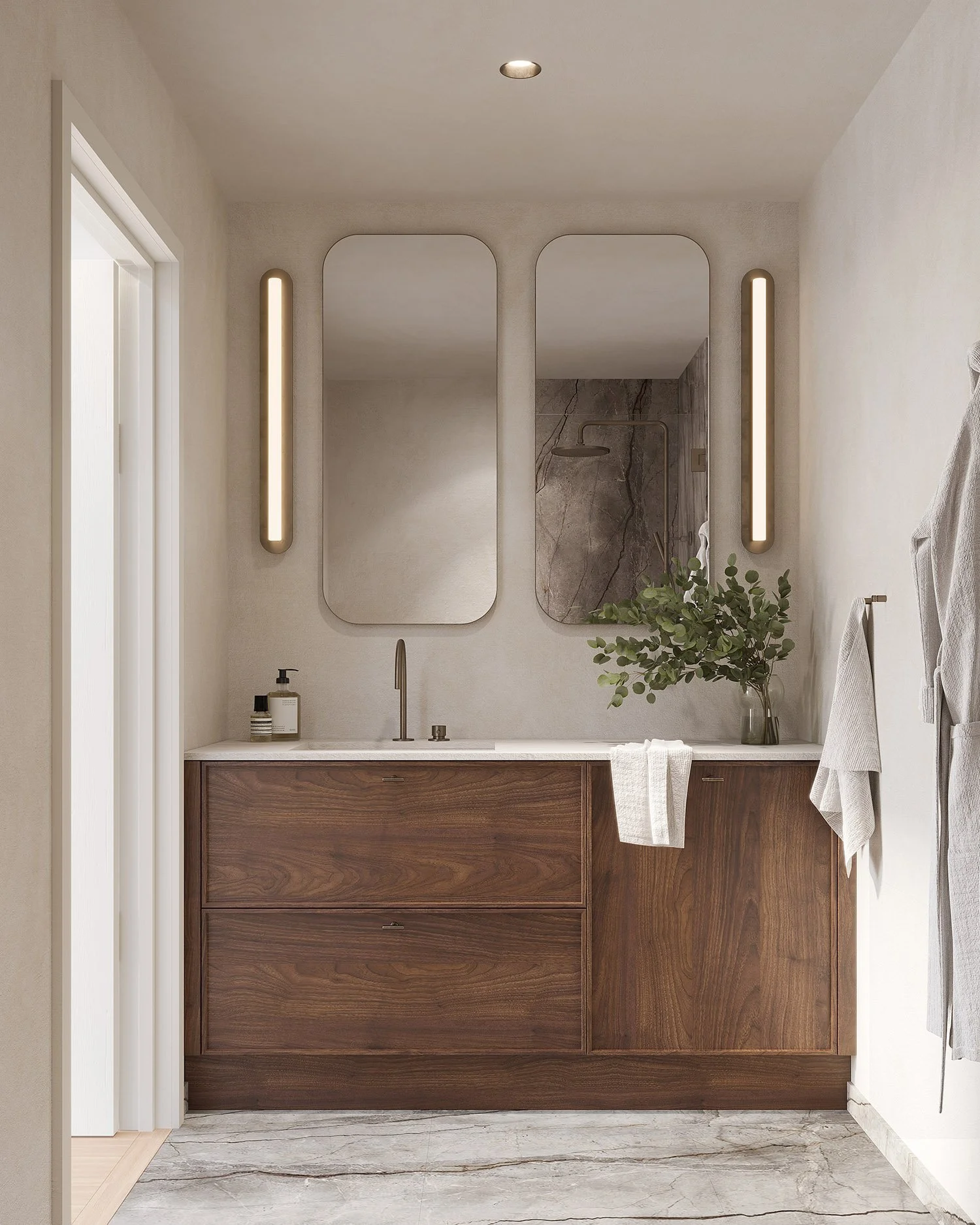 Kommoder i träfanér, bronsfärgade detaljer och genomtänkt belysning skapar en varm, modern känsla. Integrerade tvättlösningar gör vardagen smidig utan att kompromissa med designen.