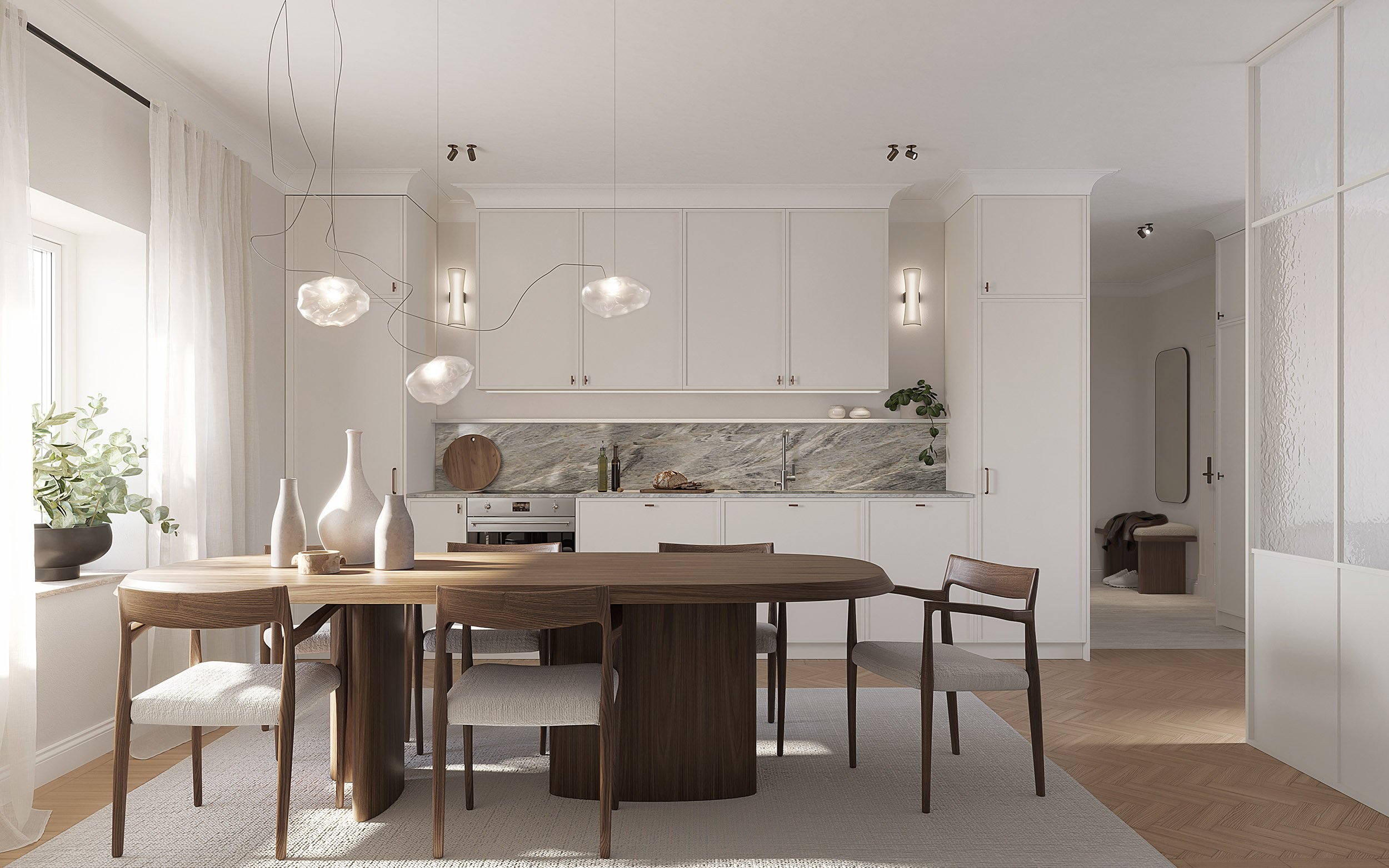 Inspirerad av husets ursprung skapas en medveten kontrast mellan klassiska detaljer och modern arkitektur. Resultatet är en personlig interiör där varje materialval fyller en funktion – visuellt såväl som taktilt.