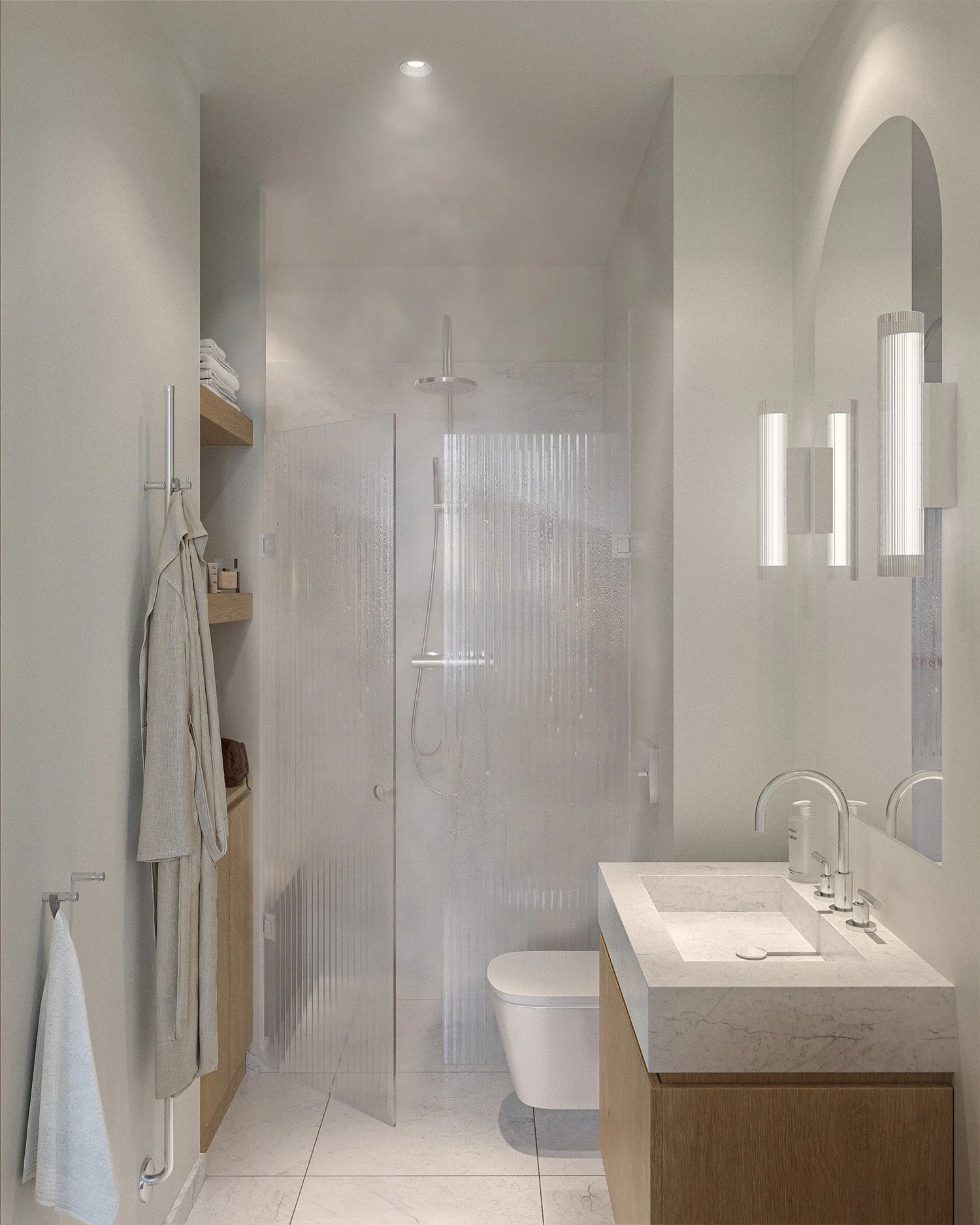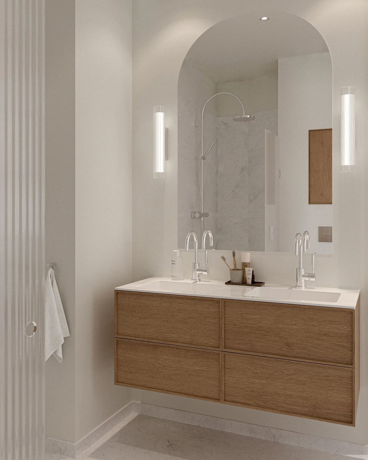 Generösa speglar, integrerad förvaring och genomtänkt ljussättning förstärker upplevelsen av komfort och kvalitet.