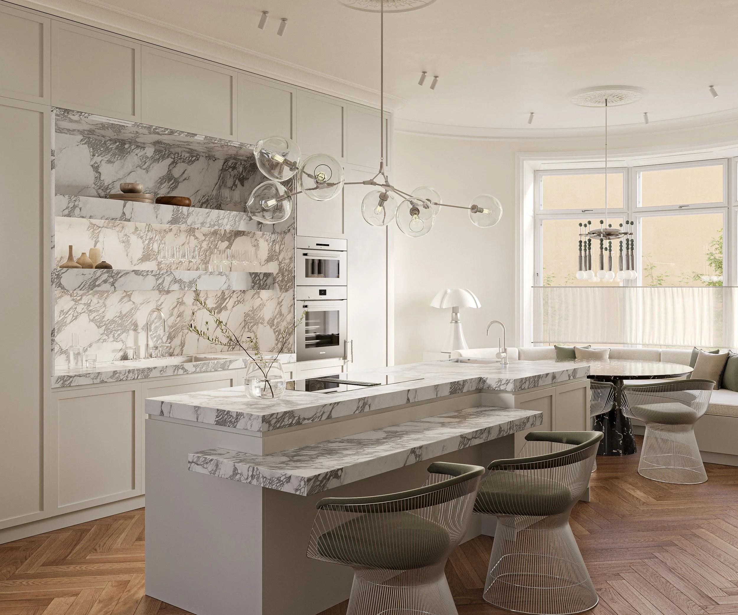 Väggarna är målade i mjuka, varma nyanser med supermatt finish som ger ett lugnt och exklusivt uttryck, medan taken hålls ljusa och neutrala för att maximera ljusflödet. Profilerade stuckaturer och takrosetter adderar subtil elegans och förstärker rummens karaktär.