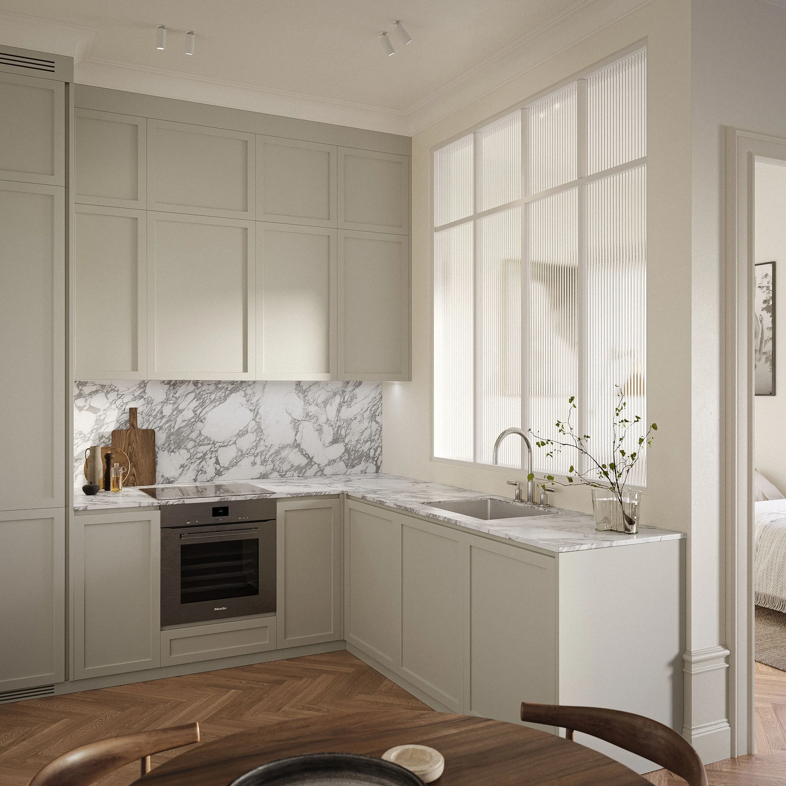 Snickerier i en mjukt varm kulör kombineras med exklusiva bänkskivor och stänkskydd i natursten. Integrerade vitvaror och dolda grepp ger ett rent, arkitektoniskt uttryck, medan noggrant utvald belysning skapar både arbetsljus och stämning.